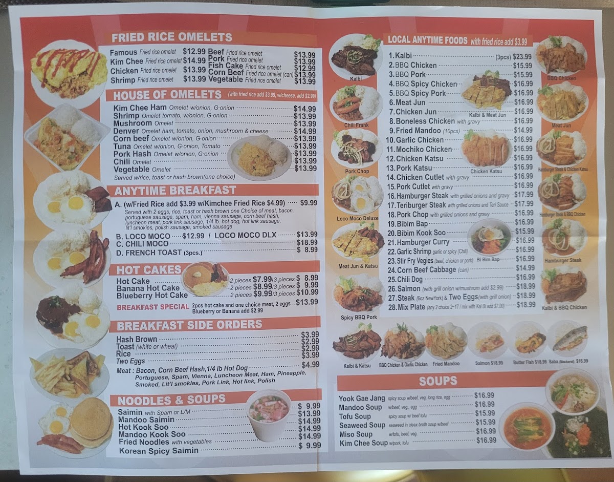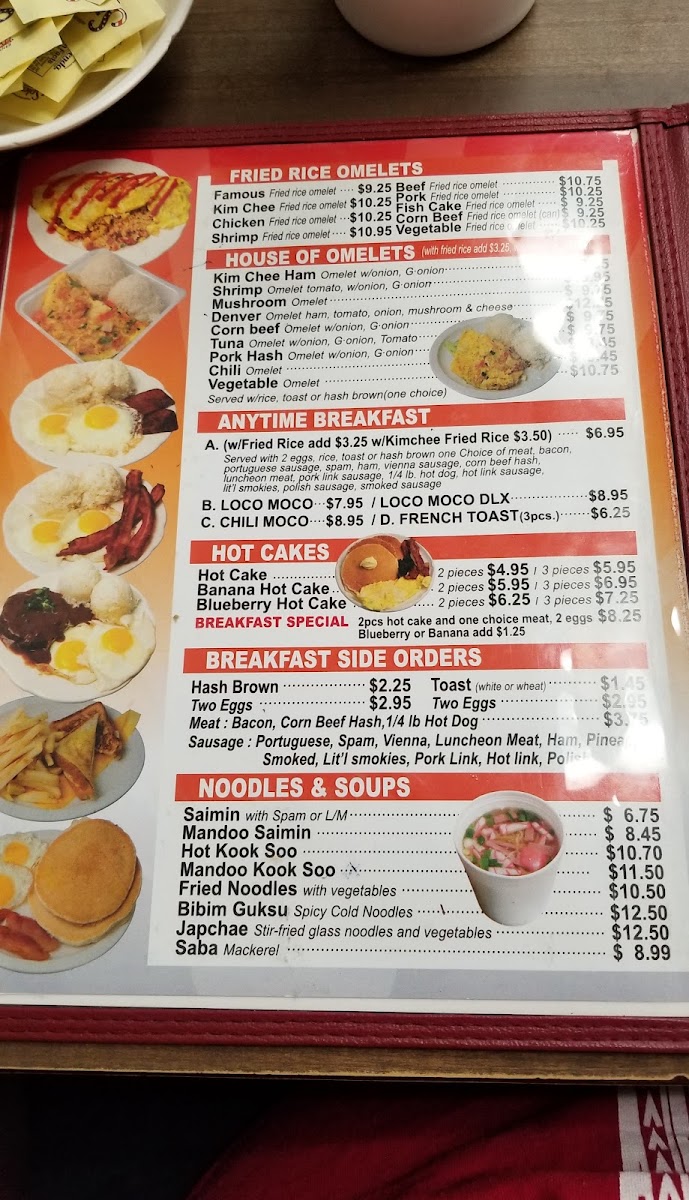 The menu features comforting choices like the Seaweed Soup and Mandoo Soup, ideal for warming your soul at just $9.25 and $9.45 respectively. Craving something hearty? Dive into the Kim Chee Fried Rice Omelet, a local favorite that’s bigger than expected, offering a delightful mix of flavors.